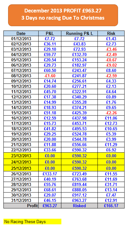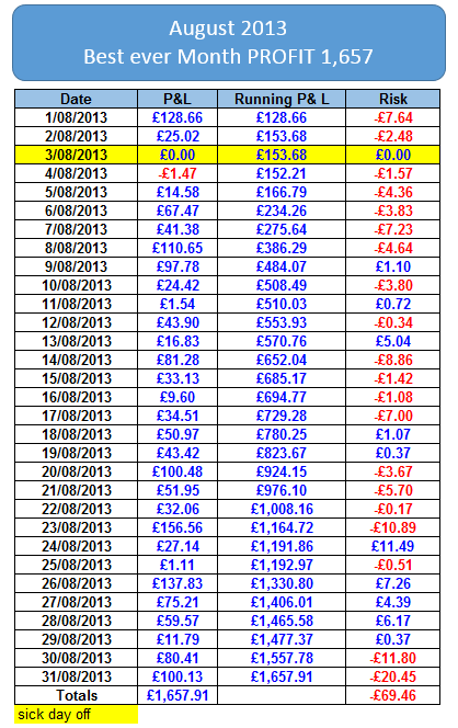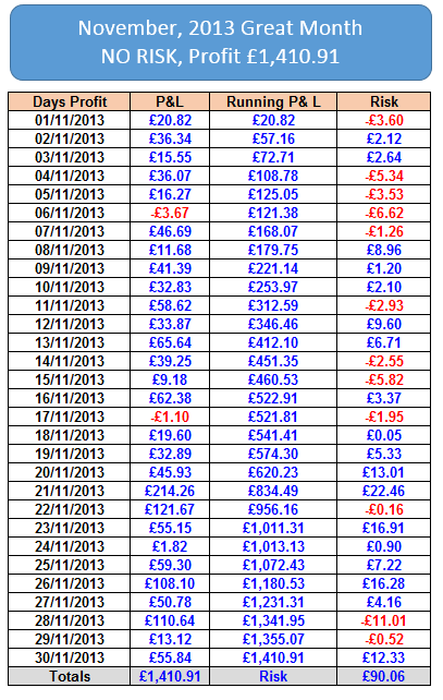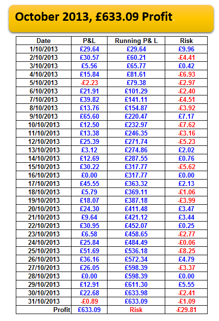 first 4 days. Maximum race risk and loss over the 4 days was £5.15 I would comment that it is not as easy as stated to achieve the time scale. The time involved in getting everything done to play races (7 is the most I had to sort in 1 day) cannot be done in under 30 minutes in my experience. I have spent well over an hour each day. However, if this continues to average the daily amount of profit shown above it is a worthwhile extremely low risk method returning far better than bank Cheers, |