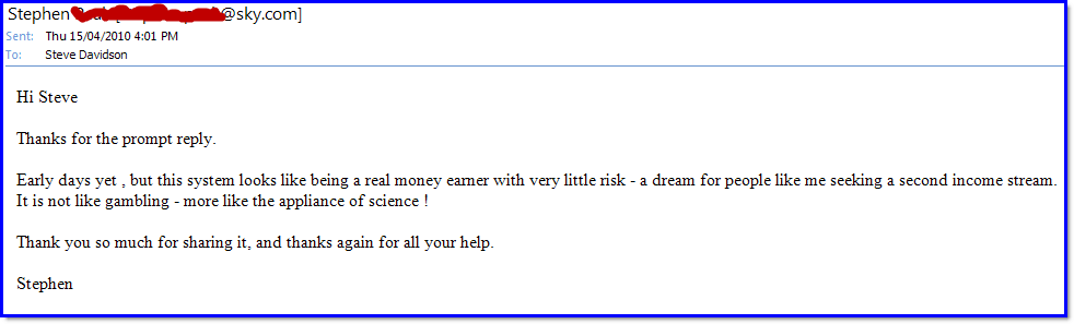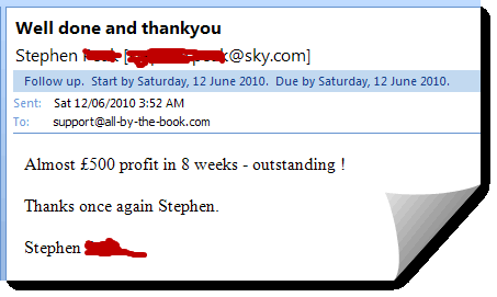 Hi Steve, Thanks for the video. As always : a picture is better than a thousand words: Many punters have been looking for the Holy Grail, and I think this is the closest thing to it that I have seen in a long long time. Looking forward to tonights UK races. Very impressed with strategy. Regards Garry W Hi Steve, I have been involved in racing for forty years & during that time i have purchased so many systems over the years, probably hundreds!. Not until I saw this one All By The Book, have I seen an opportunity to invest in the horses, and know I will win & if i do loose its only peanuts!! overall it wins most times. This is by far the cleverest way to stack the odds in my favour, and to think it’s the bookies and not Betfair that make it possible. Thanks for this brilliant piece of gear. Dave 14th April Just a brief note to say thanks for the all in the book system - ingenious !! I never thought that any testimonial was EVER genuine, but here I am sending one myself. Thanks again Regards